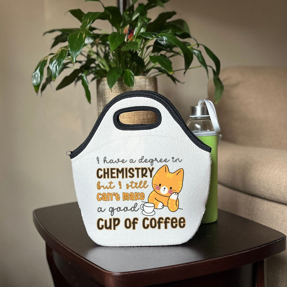 Brew up some style with this cheeky Chemistry & Coffee ☕︎🧪 Linen Cooler. Perfect for the cat-loving science grad who can't even make a decent cuppa joe! This lunch tote keeps all your snacks and drinks safe, so you can feel smarter than ever!
