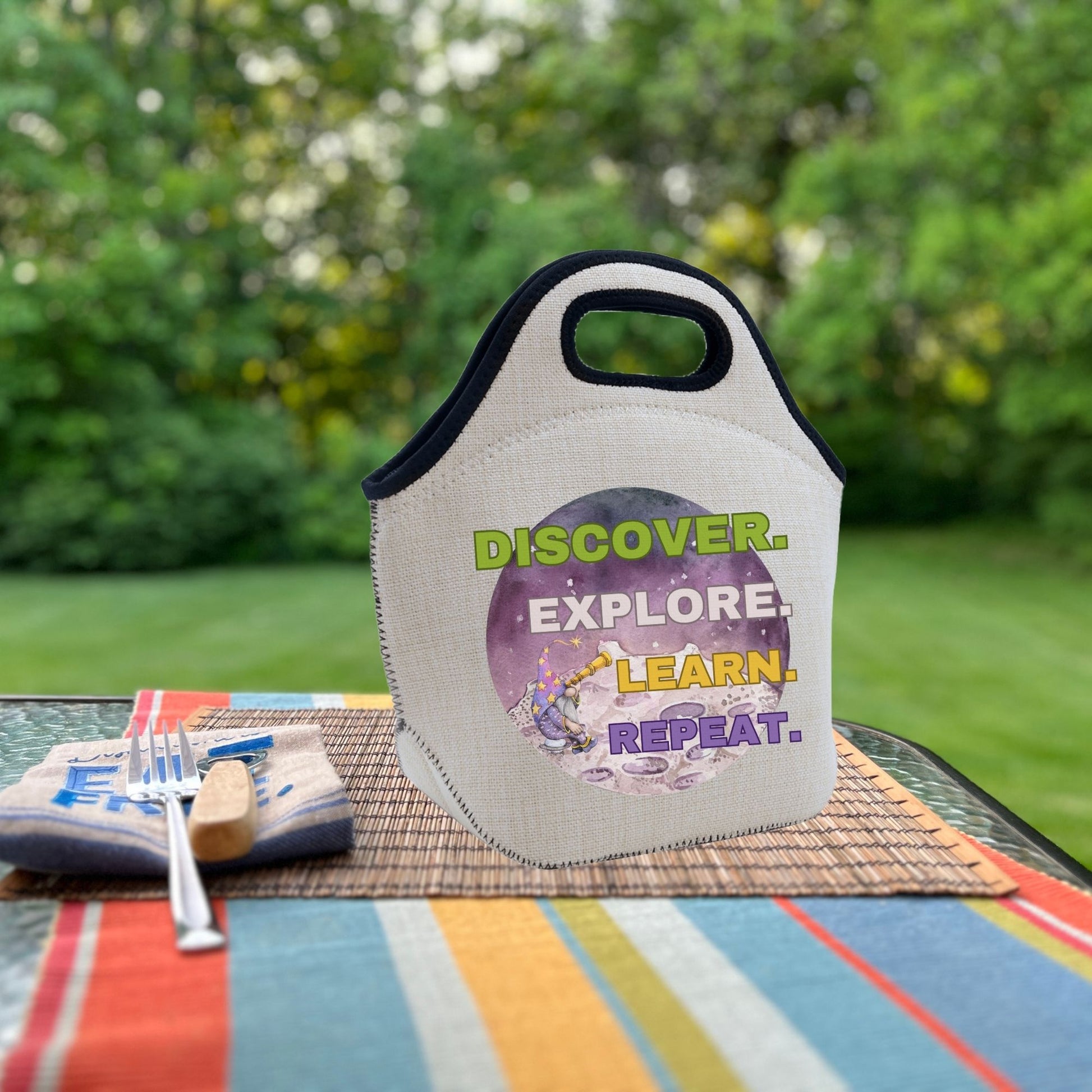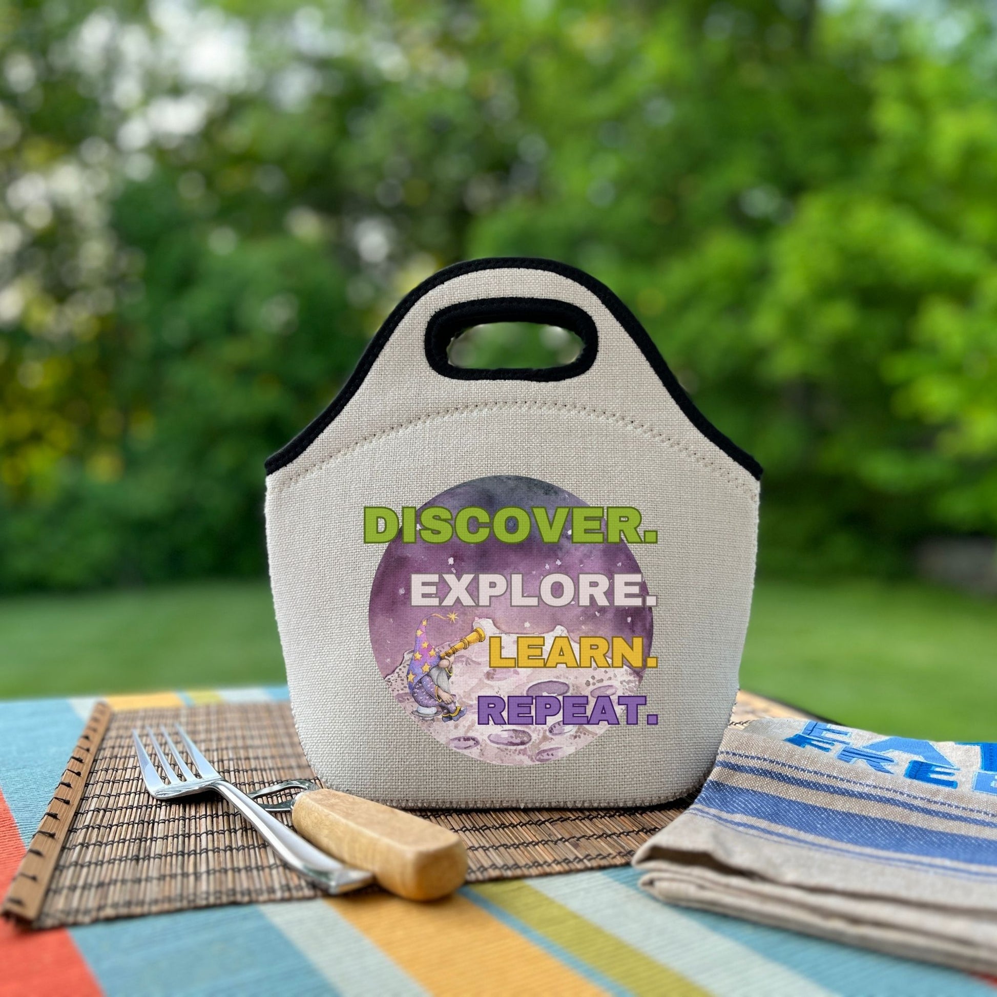 Introducing the Discover, Explore, Learn, Repeat πŸ‘€πŸ’‘ Cooler | Lunch Tote πŸ₯ͺ, where space-age discovery meets gnomish fun! Whether you're hitting the books or the beach, bring a smile and a snack with this cool cooler. Discover, explore, learn, repeat - and don't forget your lunch! πŸ€“