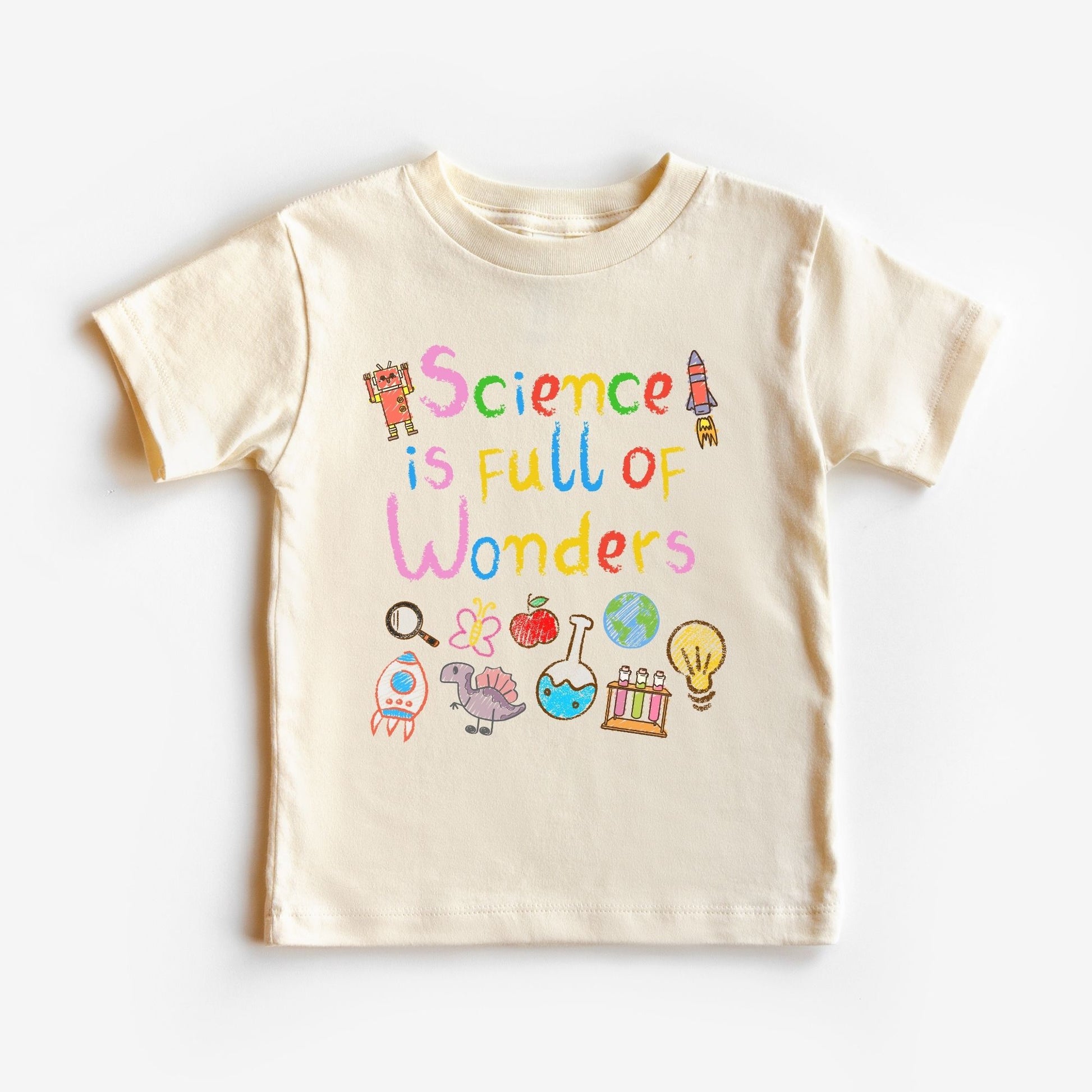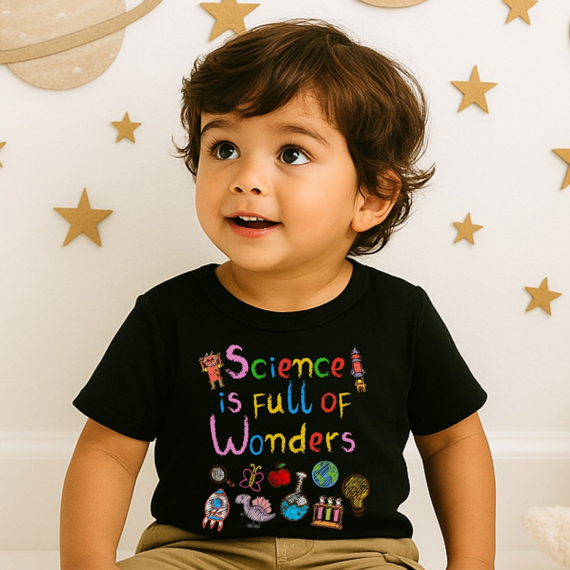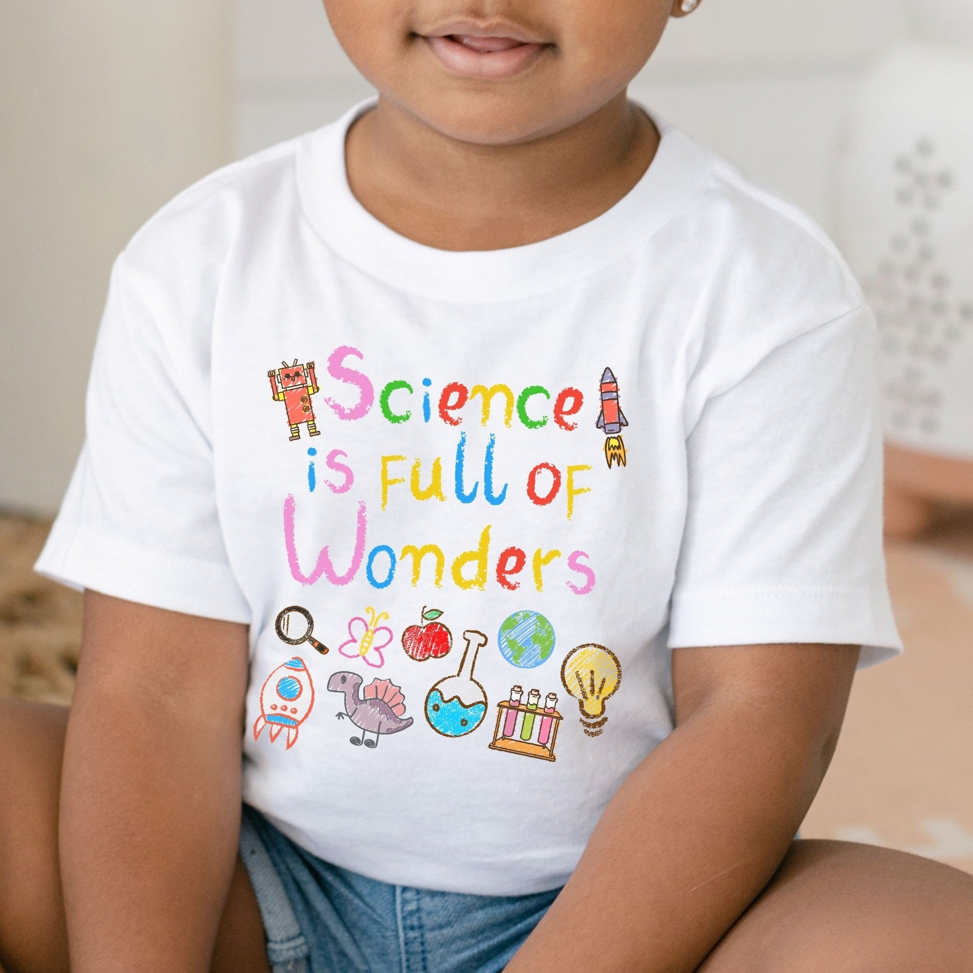 Colorful STEM kids t-shirt with playful science graphics. Soft, durable educational tee for boys and girls, ideal for school, science fairs, and gift shops.